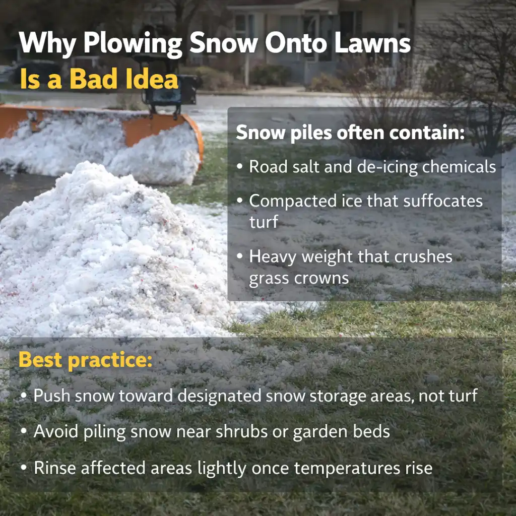 Many homeowners push or plow snow from driveways and walkways directly onto their lawns. While it seems harmless, this practice can severely damage grass and soil.